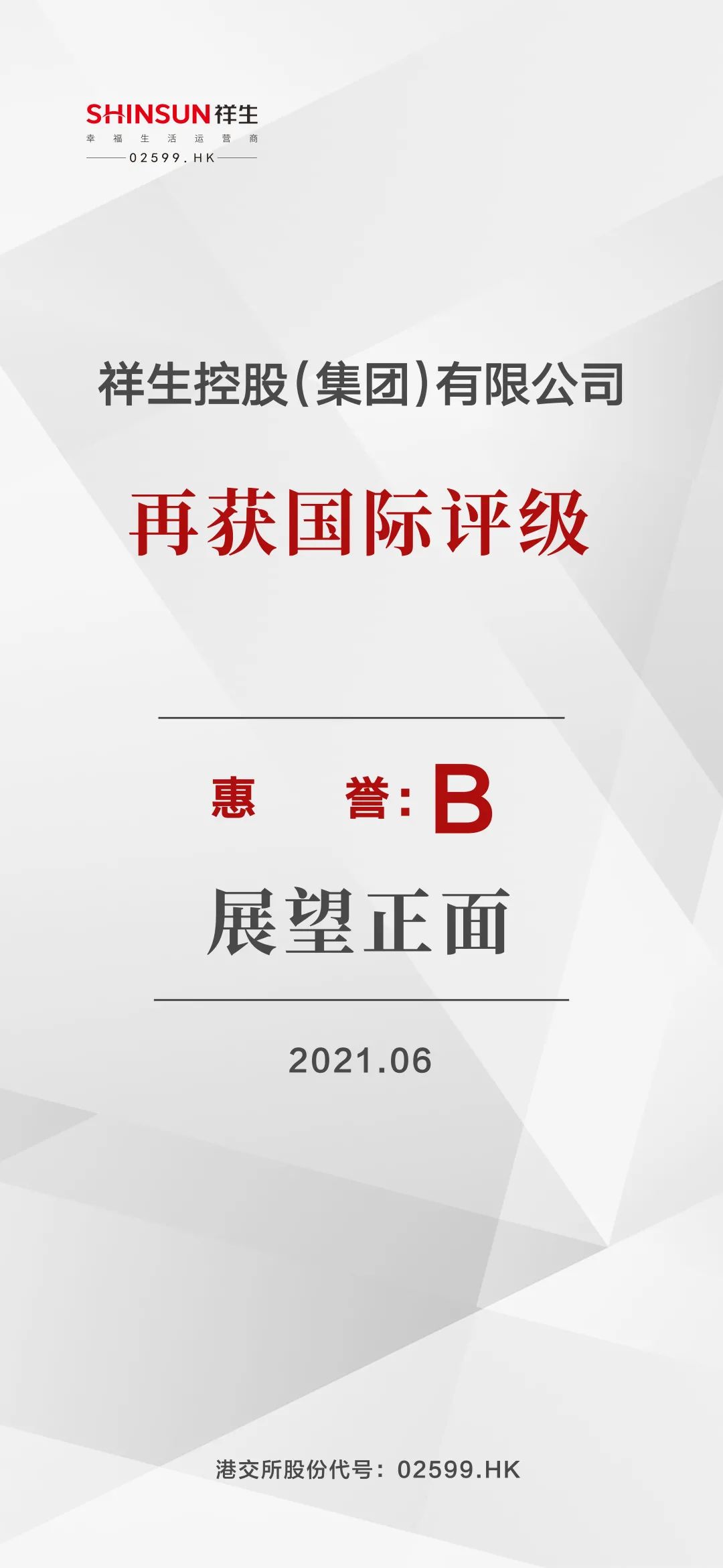 2021年6月3日,國際評級機構惠譽確認祥生控股(集團)有限公司(Shinsun Holdings (Group) Co. Ltd.,簡稱“祥生控股集團”,02599.HK)長期發行人違約評級(IDR)為“B”,展望“正面”。此前,穆迪、標普、聯合國際三家國際評級機構已相繼發布對祥生控股集團的長期主體信用評級結果——穆迪授予B2評級、標普授予B評級、聯合國際授予BB-評級,評級展望“穩定”。